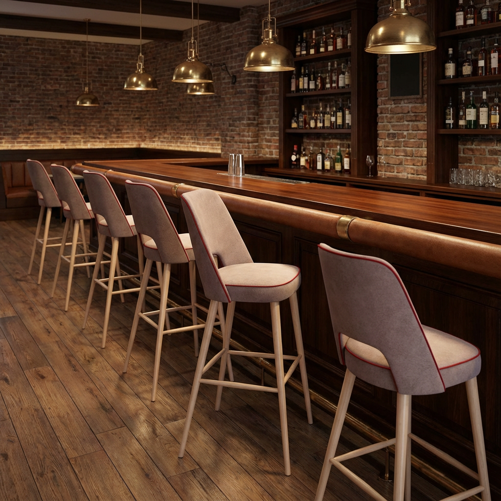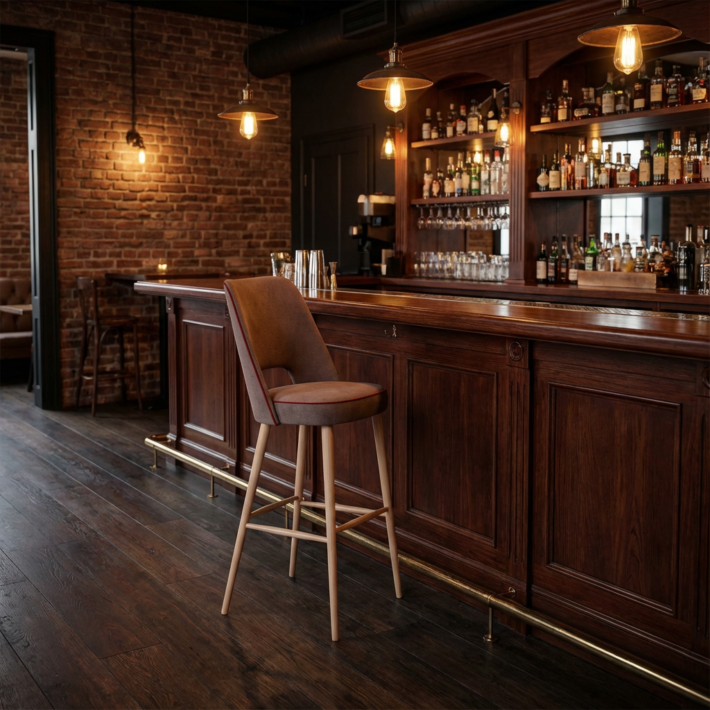 Дизайнерский барный стул на деревянном каркасе с мягкими сиденьем и спинкой.