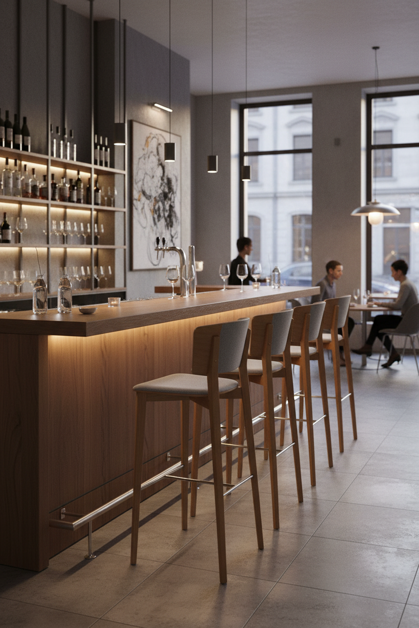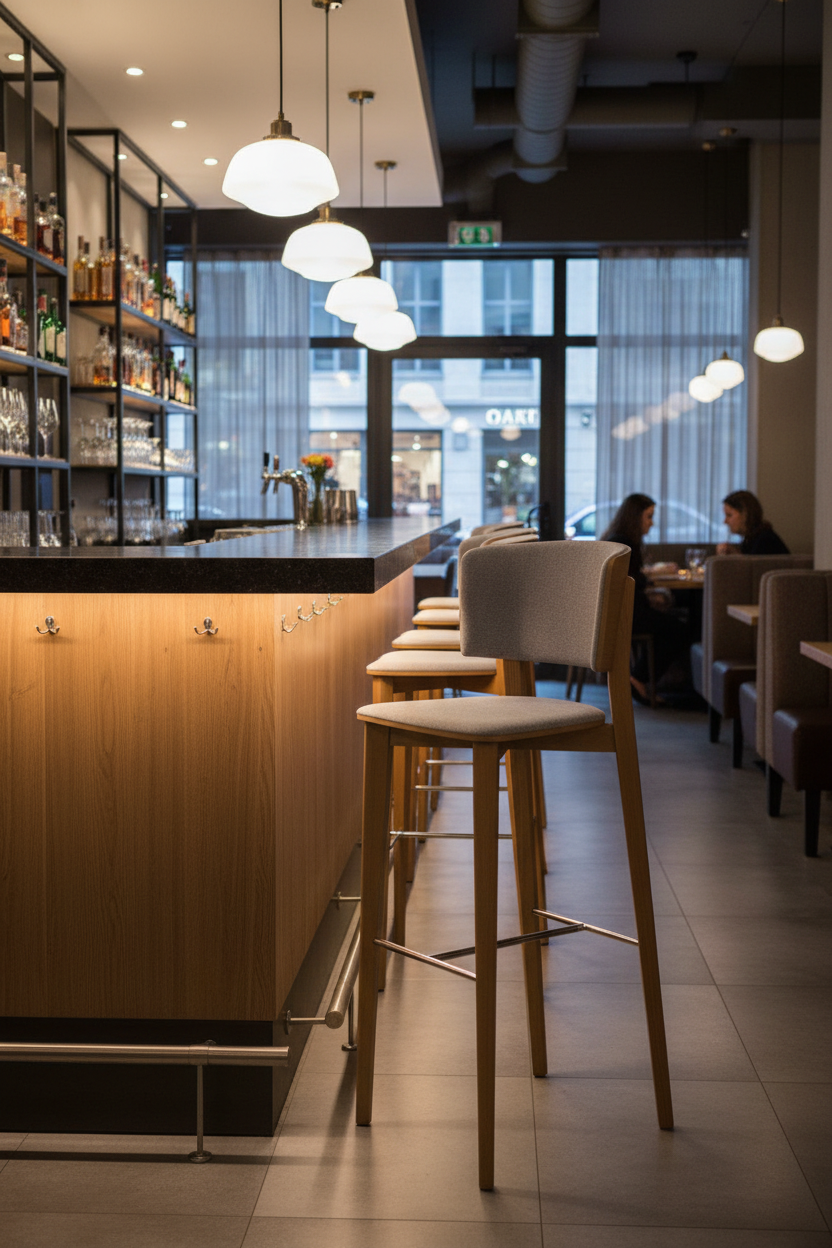 Барный стул в скандинавском стиле. Каркас стула изготовлен из массива бука, а сиденье и спинка из шпонированной фанеры в мягкой обивке. Легкая, прочная и стильная модель.