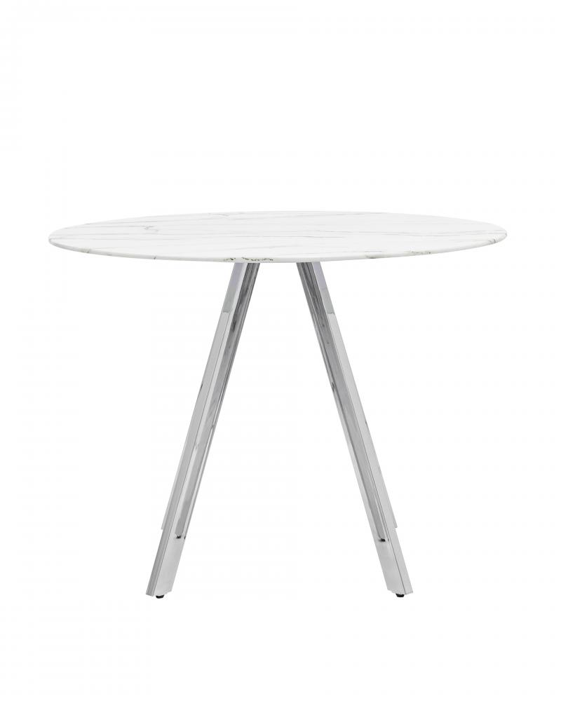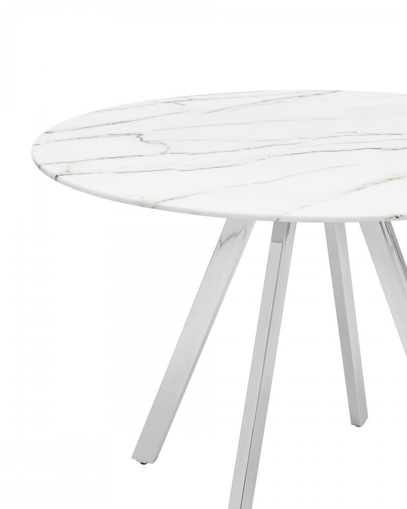 Обеденный стол с красивой стеклянной круглой столешницей белого цвета с рисунком под мрамор.