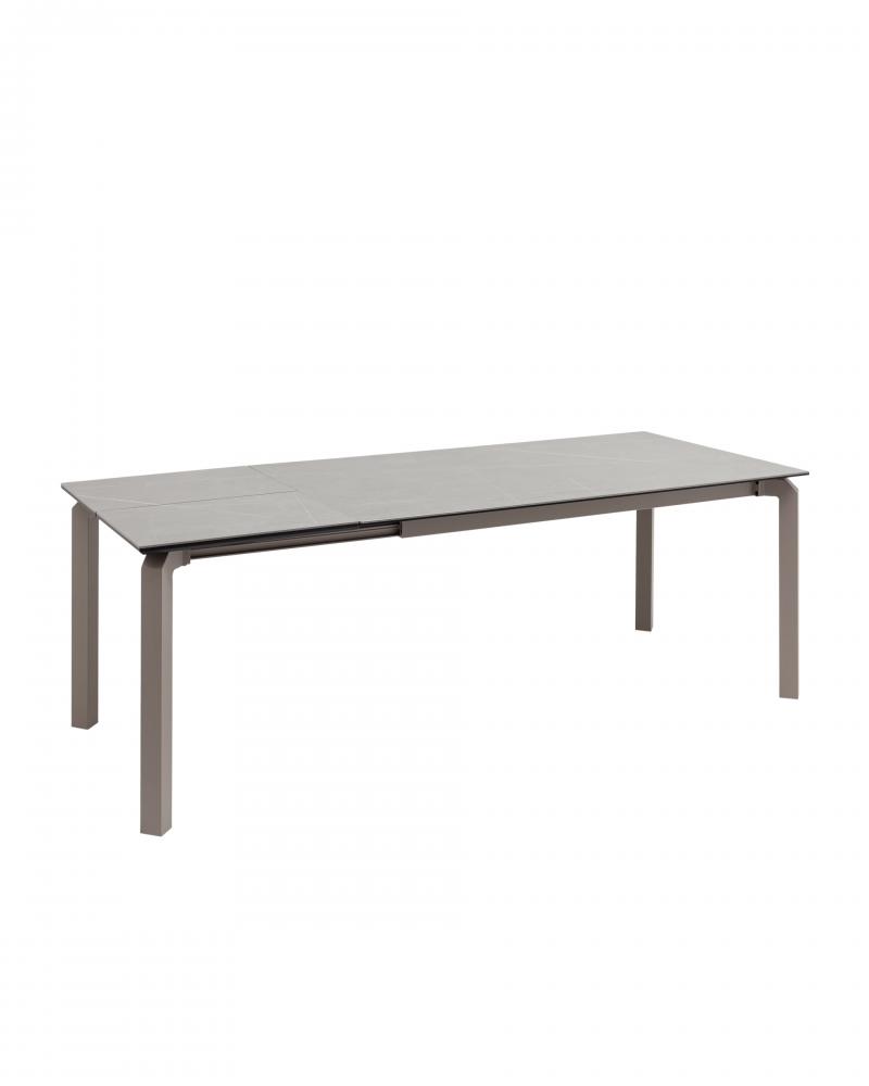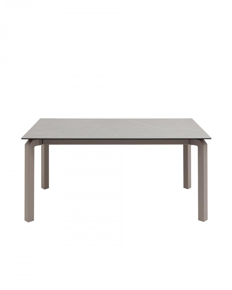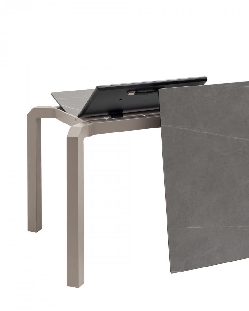 Столешница выполнена из прочной и износостойкой керамики серого цвета. Материал отличается устойчивостью к царапинам, влаге и высоким температурам, что делает стол идеальным для повседневного использования.