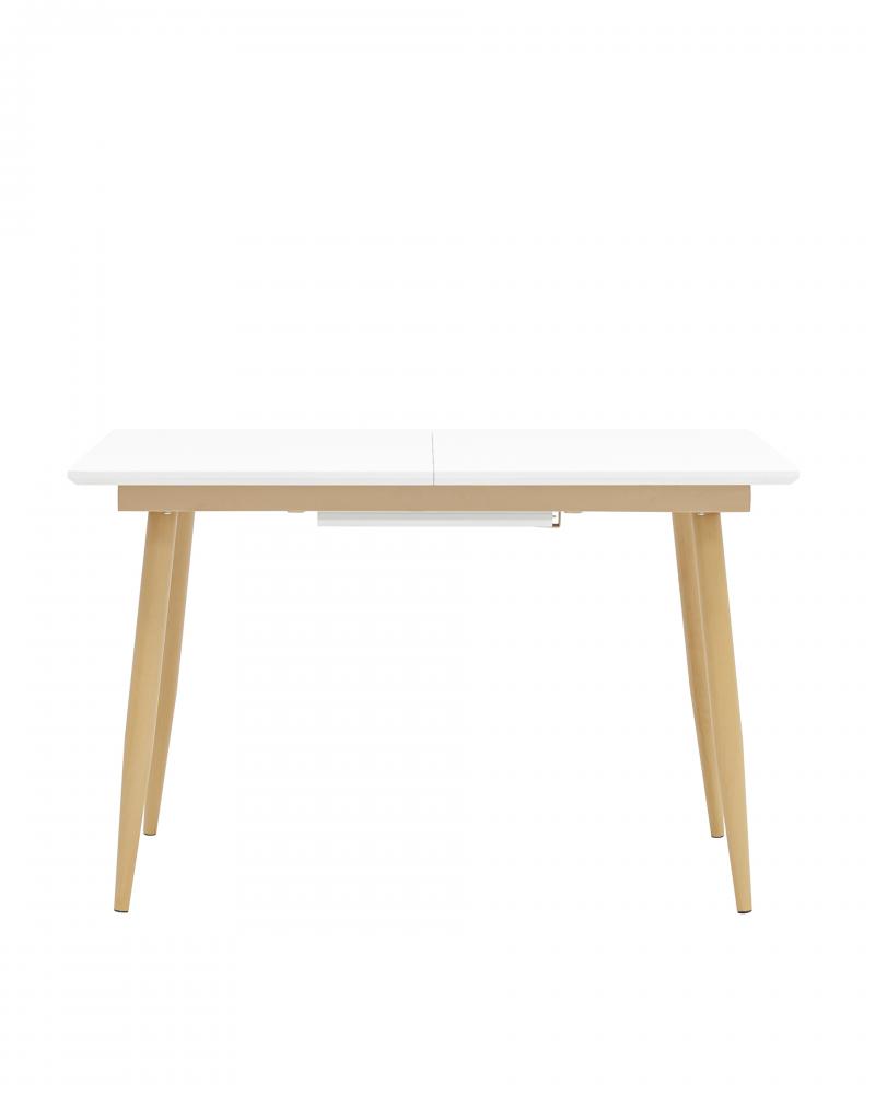 Обеденный стол в прямоугольной столешницей. Цвет столешницы белый. Ножки металлические, покрашены в цвет светлого дерева.
