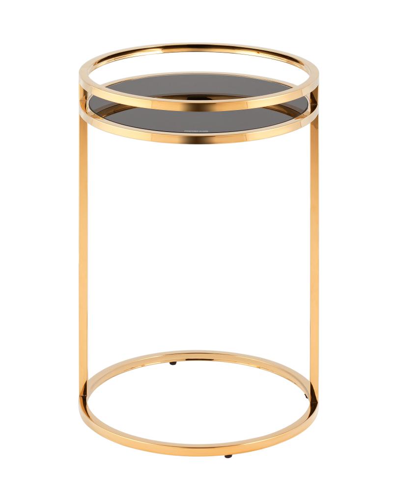 Дизайнерский журнальный столик Гестия. В качестве столешницы выступает стекло черного цвета. Основание из позолоченного металла делает круглый журнальный столик по-настоящему роскошным предметом обстановки.